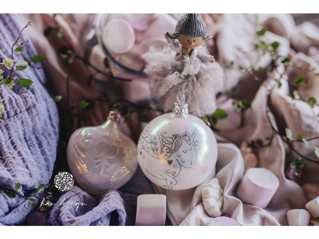 Koule má bílou skořápku, která podtrhuje jemnost a zvýrazňuje kouzelný motiv jednorožce.