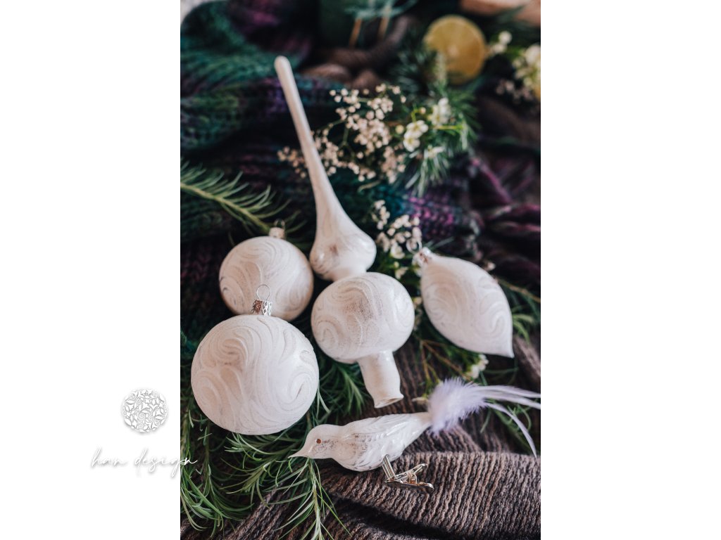 Koule ve dvou velikostech (8 × 10 cm a 6 × 8 cm), oliva malou (5 × 10 cm) a vánoční špici (výška 28 cm, průměr 7 cm).