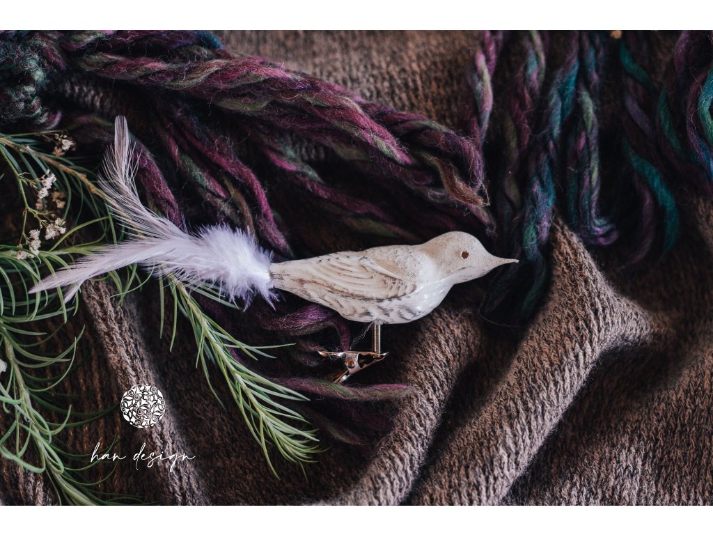 Jemný ptáček zdobený plastickým motivem krajkových listů v elegantním bílostříbrném odstínu skořápky působí jako symbol něhy a vznešenosti. Jeho ladné křivky a ozdobné peří vnášejí do vánoční dekorace lehkost a poetiku přírody.