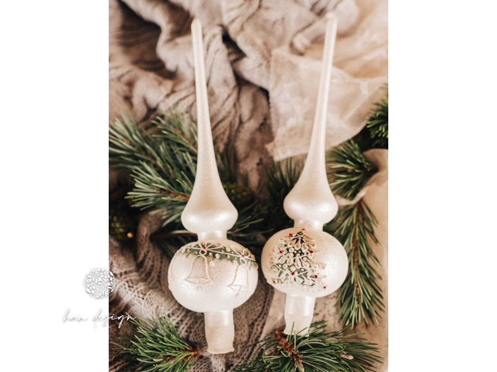 Na samotném vrcholu vánočního stromku zazáří jako koruna – elegantní špice s motivem stromečku. Vysoká a štíhlá, přesto jemná a ladná, připomíná tichý lesní kout, kde sníh tiše usedá na větve a vzduch voní zimou. Ozdoba v sobě nese slavnostní klid a tradiční krásu českých Vánoc.
