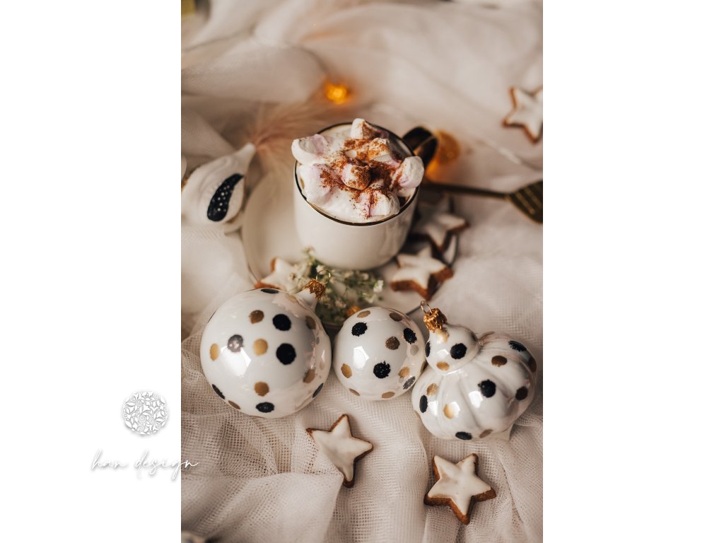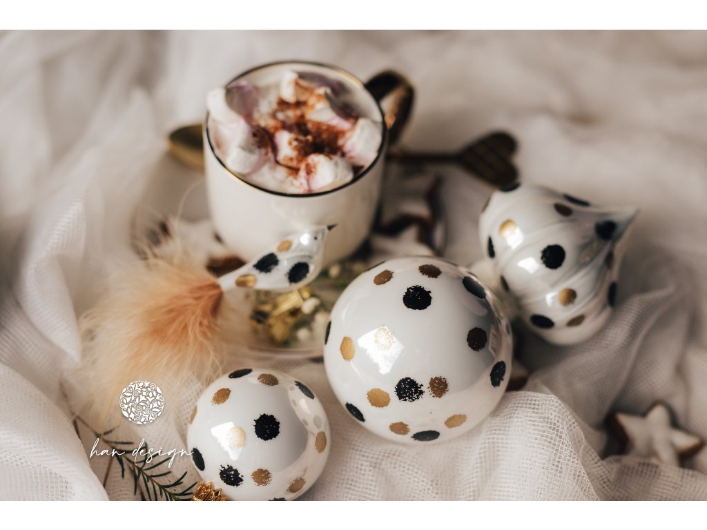 Jemný bílý porcelán, zdobený ručně malovanými střapatými puntíky, vytváří hravý, přitom elegantní vzhled. Drobný detail dodává kouli živost a osobitost, díky nimž zaujme svou jedinečností a stylem.