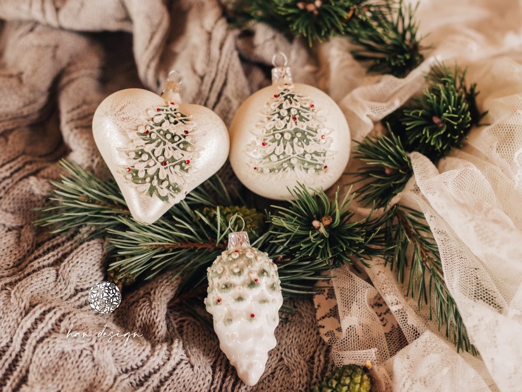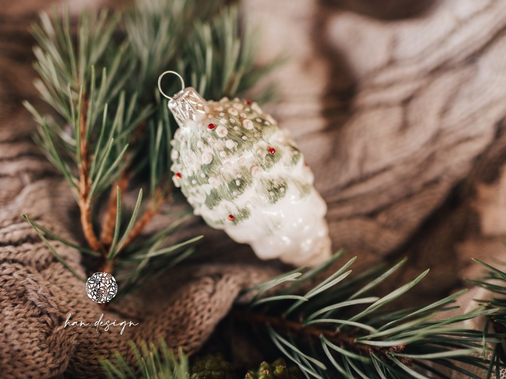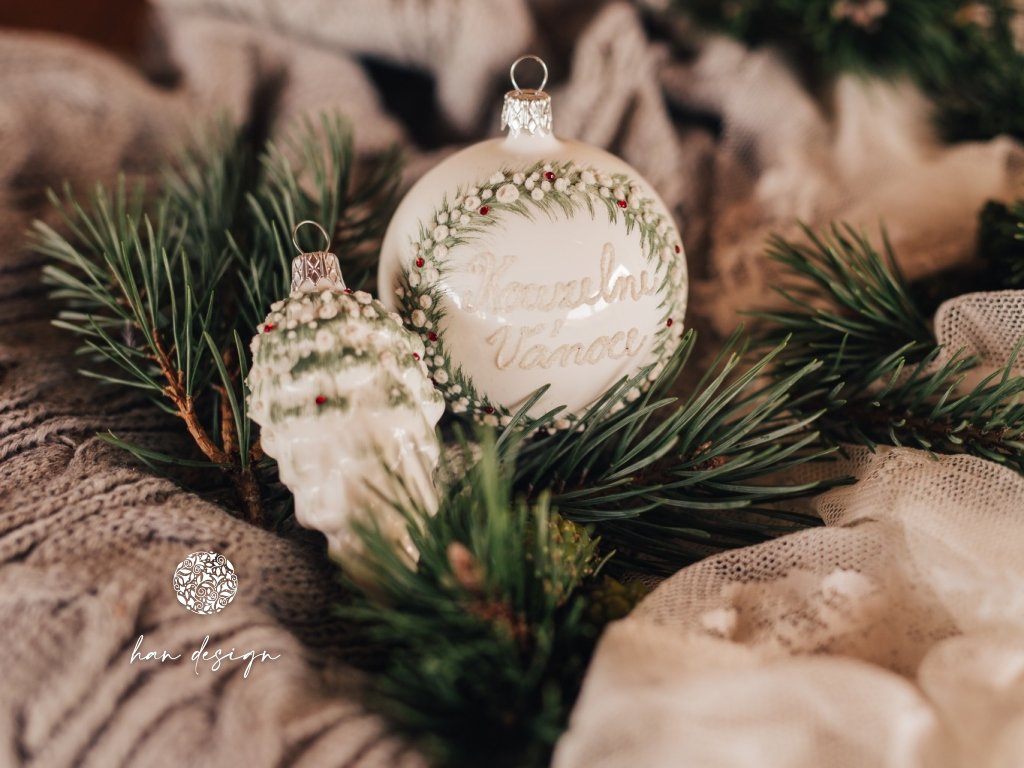 Jemná šiška v barvě bílého porcelánu je ozdobena drobnými motivy věnečku – bez slov, a přesto plná tichého poselství. Připomíná vůni jehličí, zimní les a klid vánoční noci. Malované detaily nesou kouzlo okamžiku a jemnou krásu přírody. Šiška jako symbol ticha a hojnosti se tak stává poetickou součástí celé kolekce.