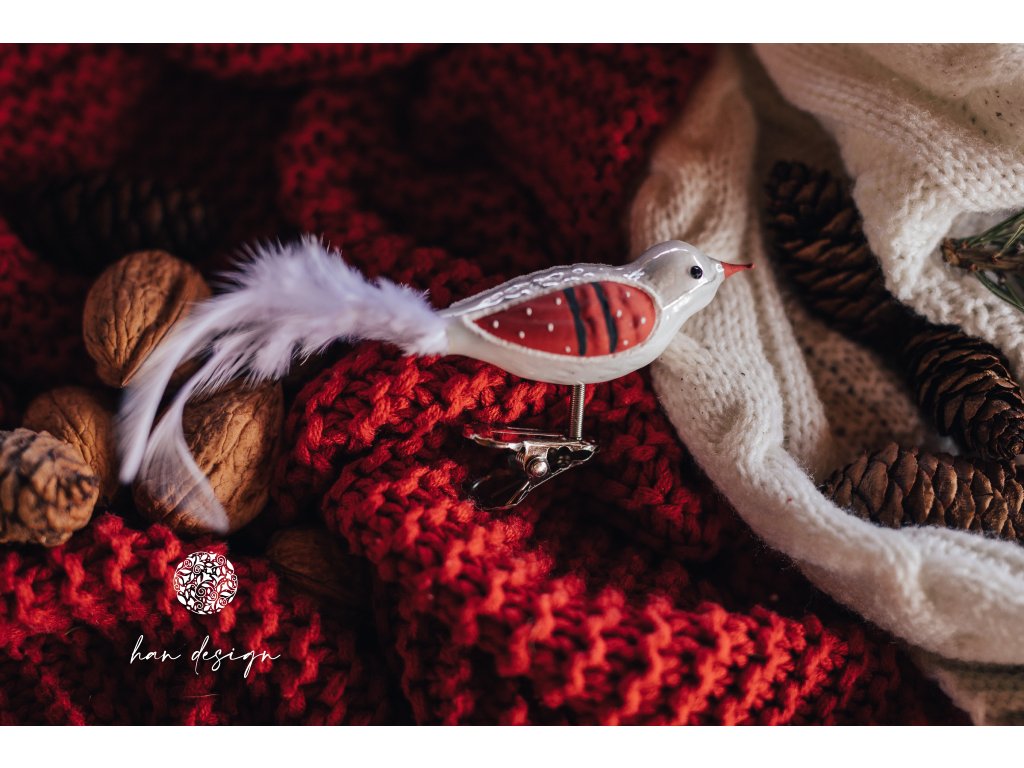 Jemný ptáček s ozdobným peřím v bílé porcelánové barvě nese ducha edice skřítka s čepicí, který mu propůjčuje hravý a přívětivý výraz. Povrch ozdoby je hladký a jemně se leskne jako ranní mráz pokrývající tichou krajinu. Přináší klid a něžnou pohodu, jako tichý zpěv vánočních dnů.