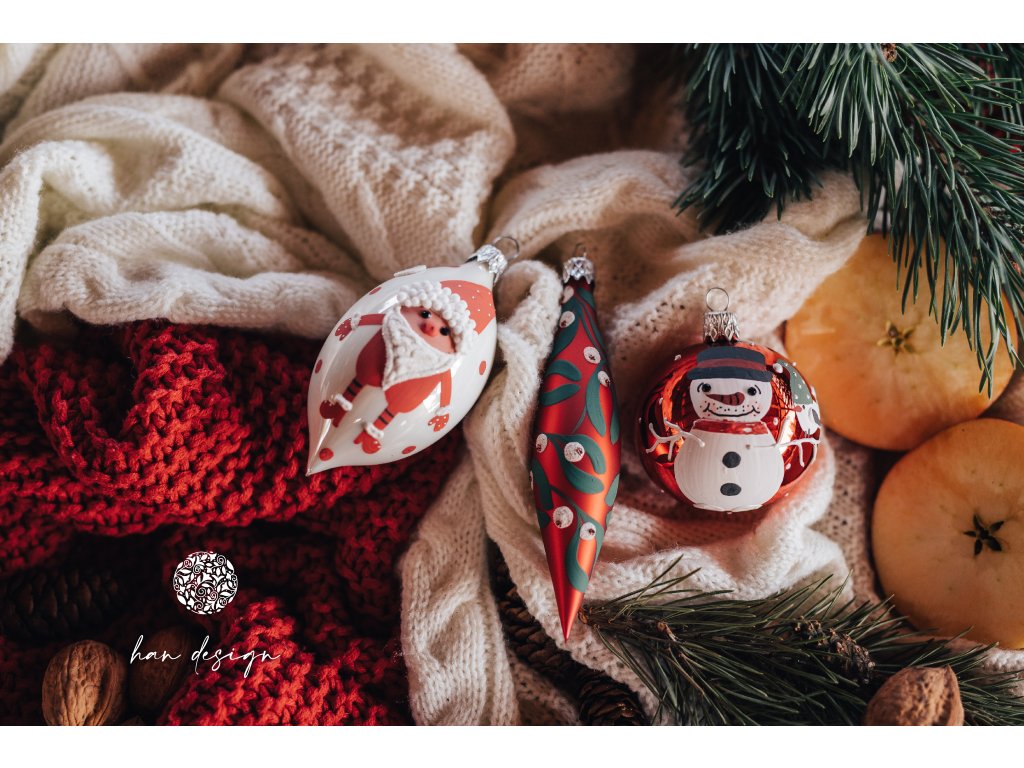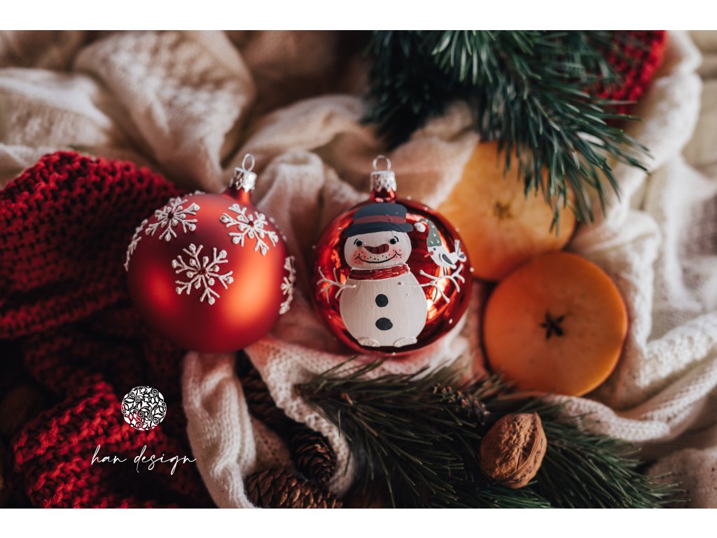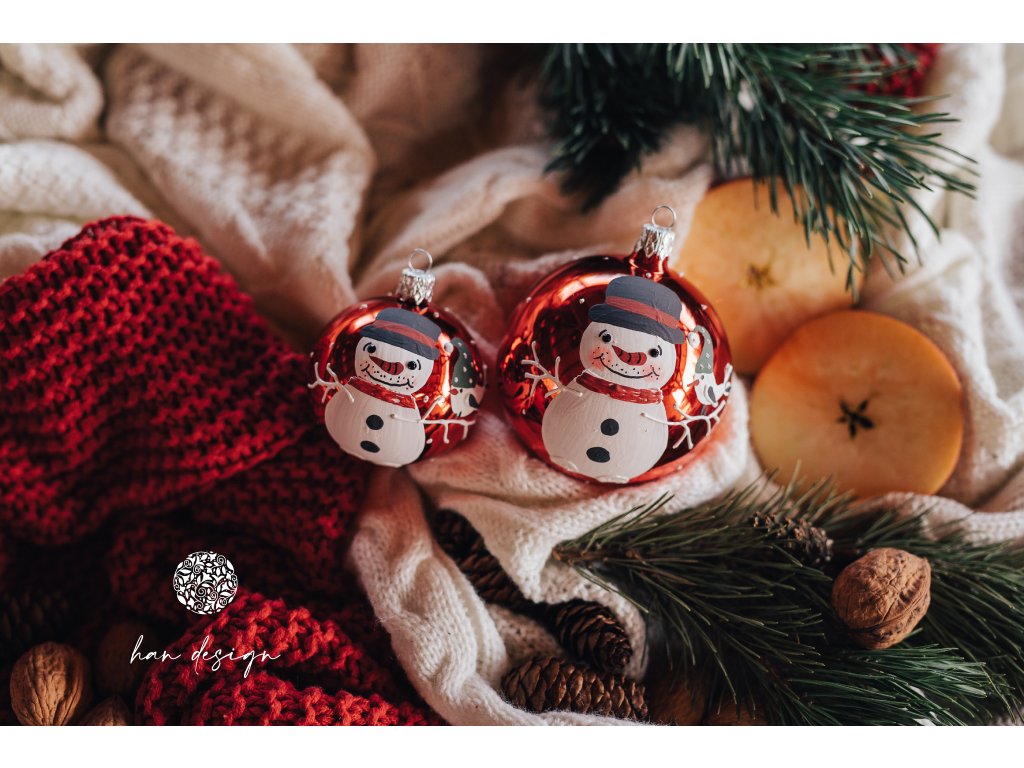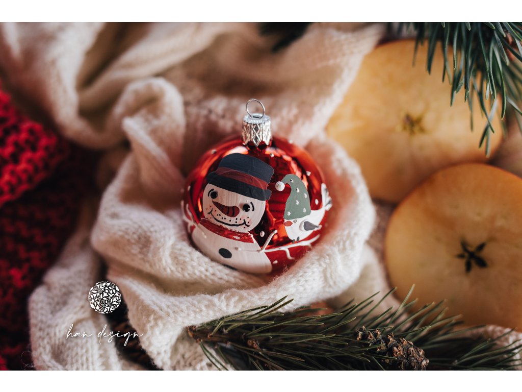 Jemný motiv sněhuláka s malým ptáčkem zdobí povrch koule v syté červené lakované barvě. Plastický dekor vytváří dojem živosti a hravosti, která oživí každý prostor. Lak podtrhuje teplý tón barvy a dodává ozdobě moderní, a zároveň nadčasový charakter. Koule působí jako symbol radosti a přátelství.