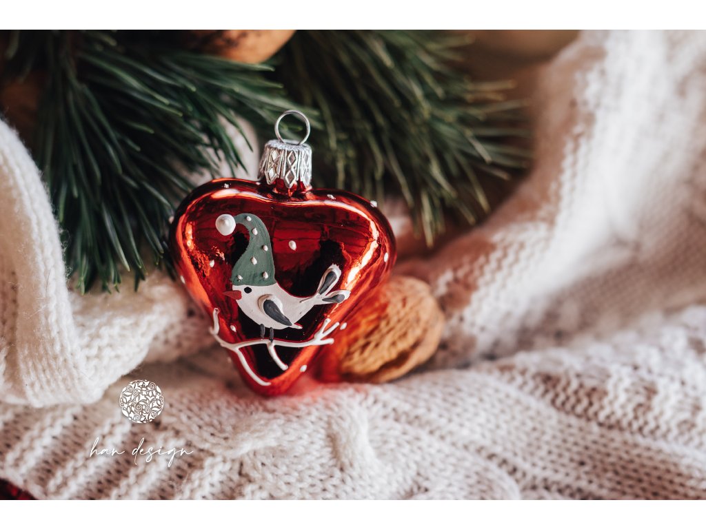 Vánoční skleněná ozdoba – malé srdce z edice sněhulák s ptáčkem