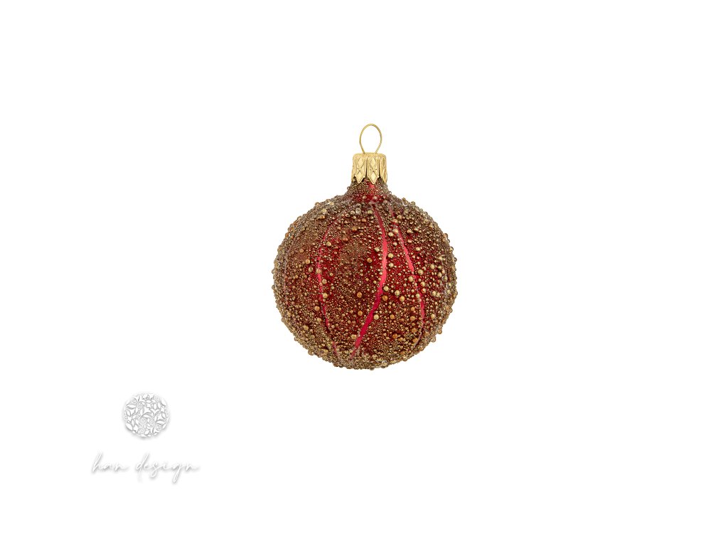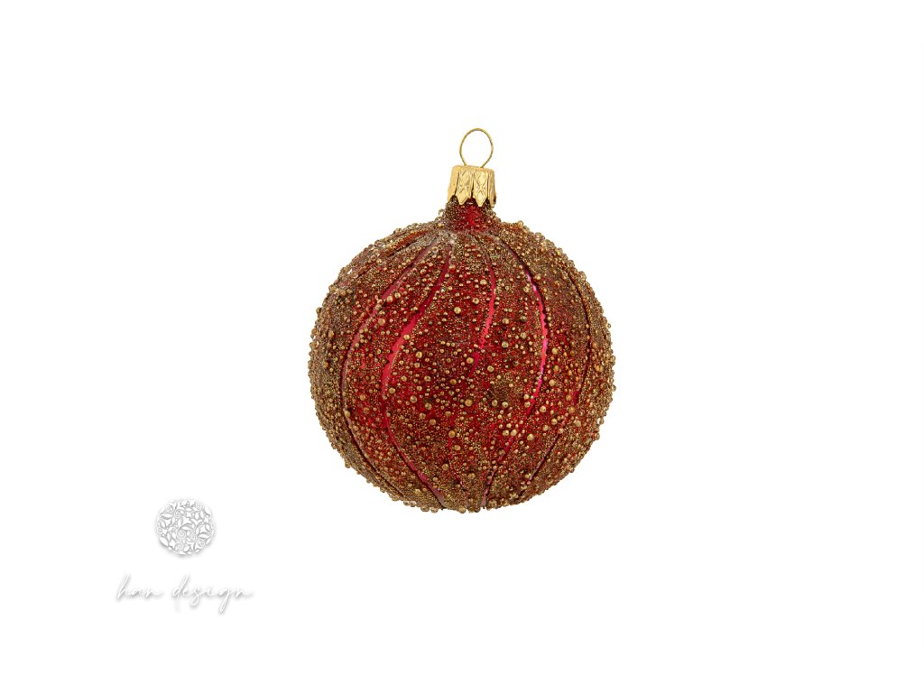 Elegantní koule v barvě červeného laku s jemným dekorem inspirovaným motivem mořského korálu. Lesklý povrch a plastický vzor dodávají kouli hloubku a luxusní vzhled, který zvýrazňuje precizní ruční práci. Tento ručně vyráběný kousek je nadčasovou dekorací, vhodnou po celý rok.