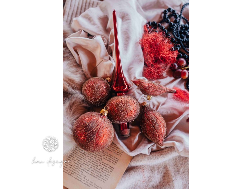 Koule „Šarlatový sen“ (8 × 10 cm a 6 × 8 cm), vánoční špici (28 × 7 cm), ptáček velký s ozdobným peřím (15 × 5 cm).