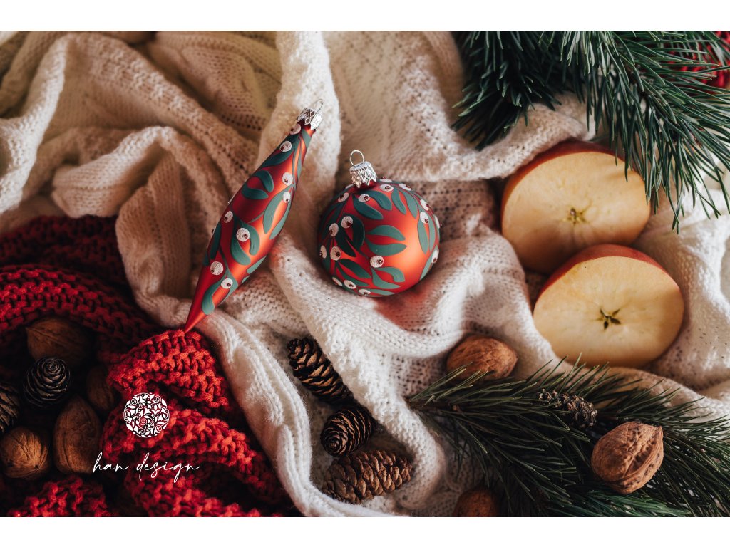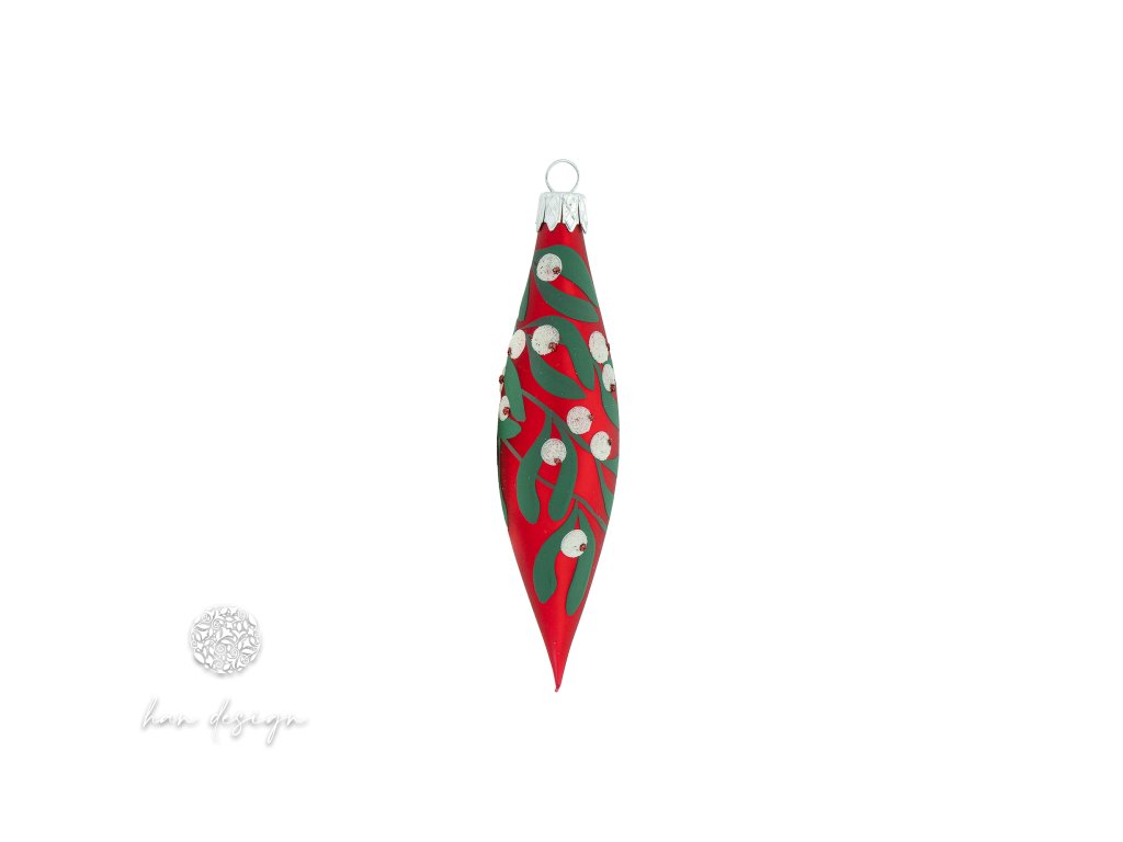 Štíhlá oliva v syté červené matné barvě zdobí povrch jemný vzor jmelí s kuličkami. Jemná struktura připomíná sametový závoj večera, zatímco reliéf rozzáří kouzelnou atmosféru a vnáší do interiéru nádech kouzla a harmonie. Tato ozdoba je tichým poslem štěstí, hojnosti a rodinné pohody.