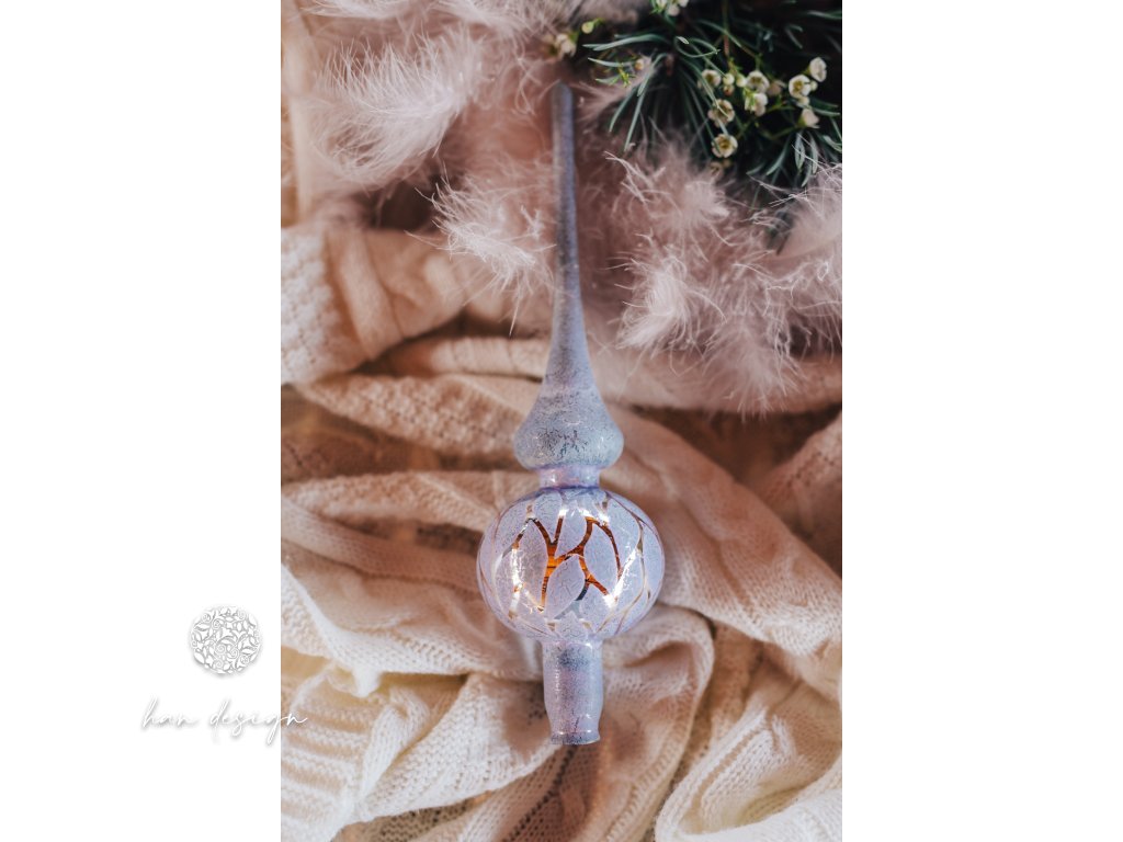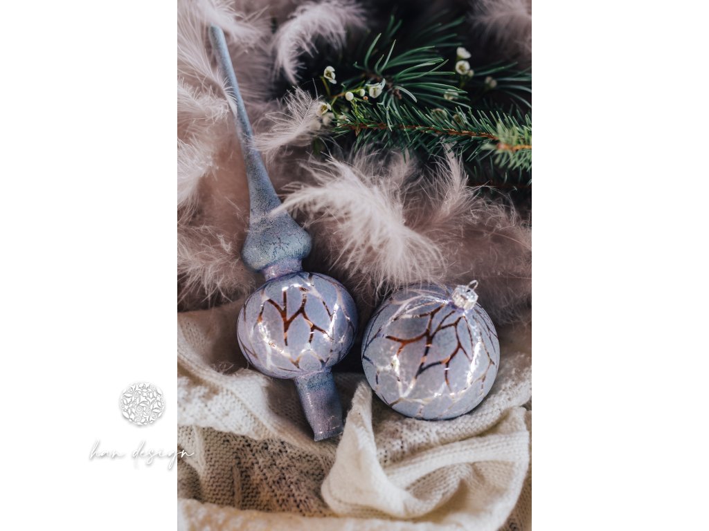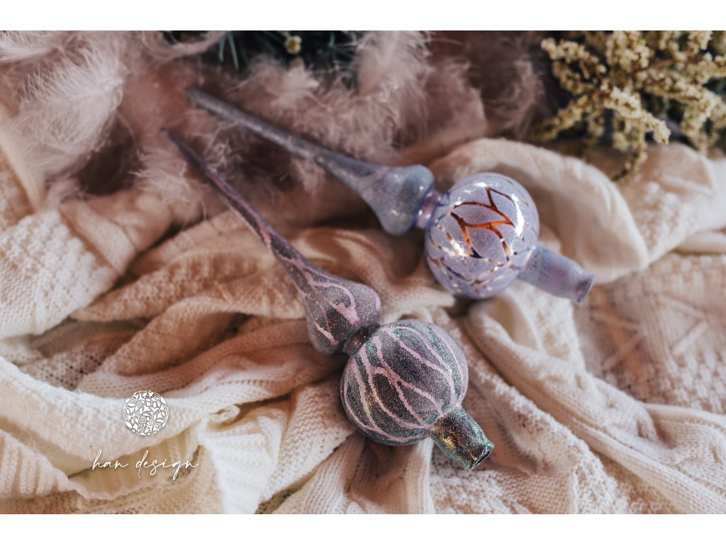 Zdobená špice plastickým dekorem vylupovaných listů ve fialovostříbrném efektu připomíná křehké větvičky pokryté mrazivou námrazou. Její elegantní tvar a jemné třpytivé detaily dodají vánoční výzdobě vznešenost a noblesu.
