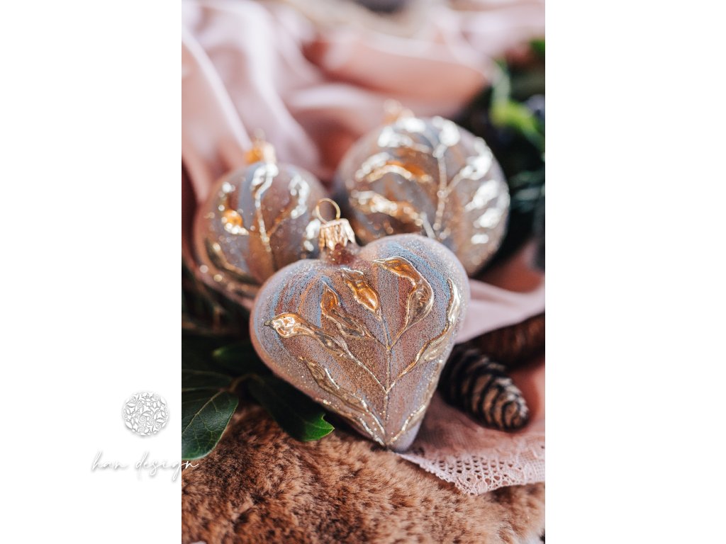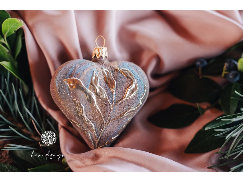 Vánoční skleněná ozdoba – srdce velké s motivem lesklých listů