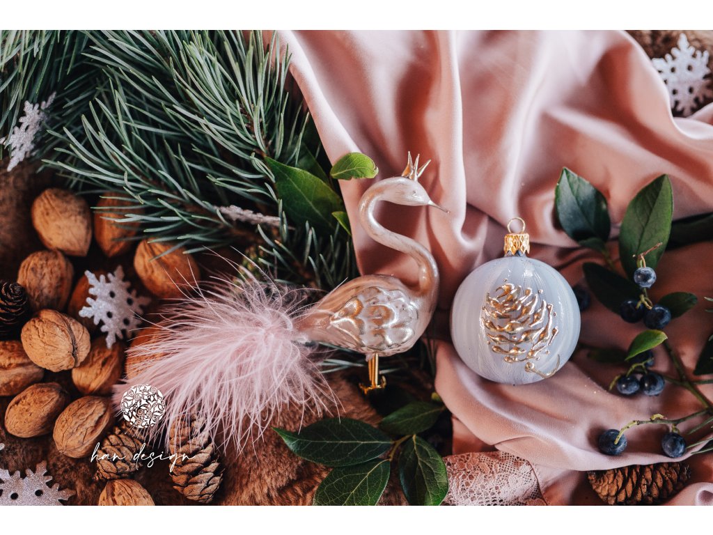 Vánoční skleněná ozdoba – labuť s motivem šupinaté šišky