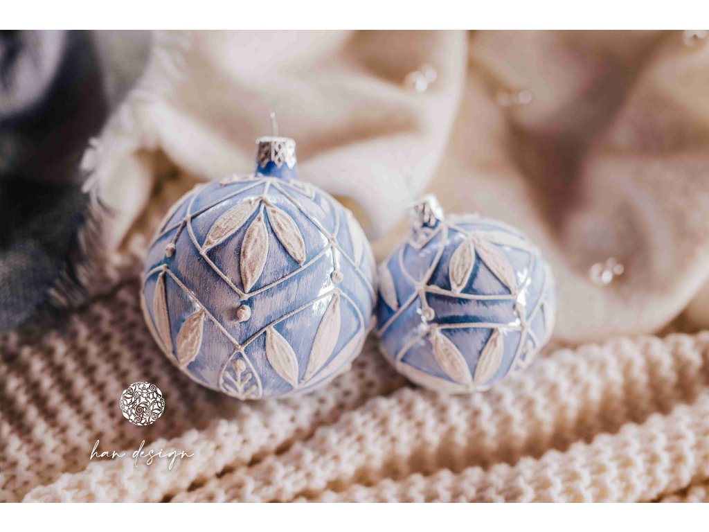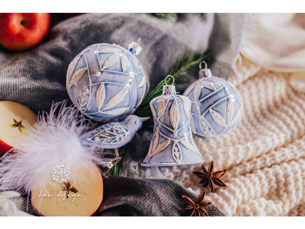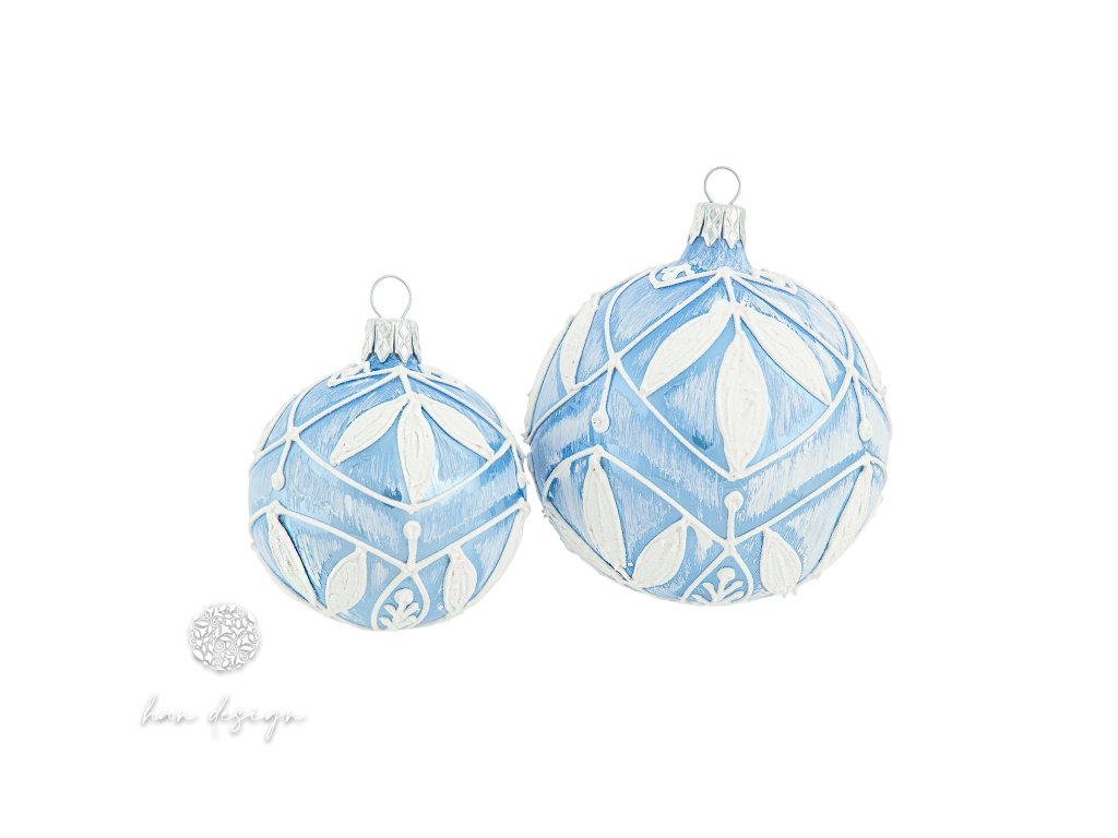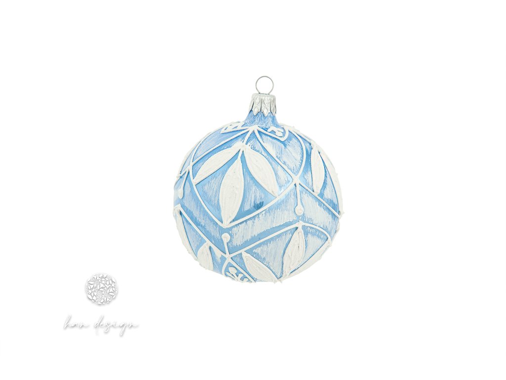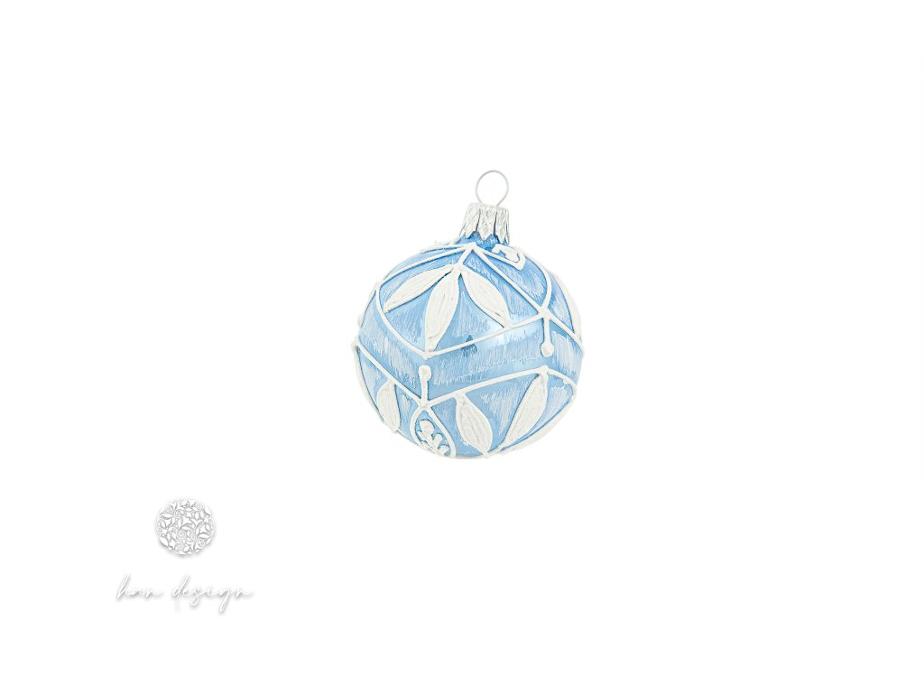 Jemné sněhové tóny se snoubí s výraznou listovou sítí na světle modrém porcelánovém podkladu a vytvářejí dojem zimního rána, kdy každý motiv hraje vlastní jemnou melodii světla. Plastický reliéf a čisté linie dodávají ozdobě křehký půvab a elegantní výraz, který zaujme i v minimalistické vánoční výzdobě.