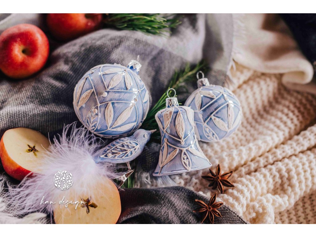 Jemné sněhové tóny se snoubí s náznakem listové sítě na světle modrém porcelánovém podkladu a vytvářejí dojem zimního rána, kdy každý motiv hraje vlastní jemnou melodii světla. Plastický reliéf a čisté linie dodávají ozdobě křehký půvab a elegantní výraz, který zaujme i v minimalistické vánoční výzdobě.