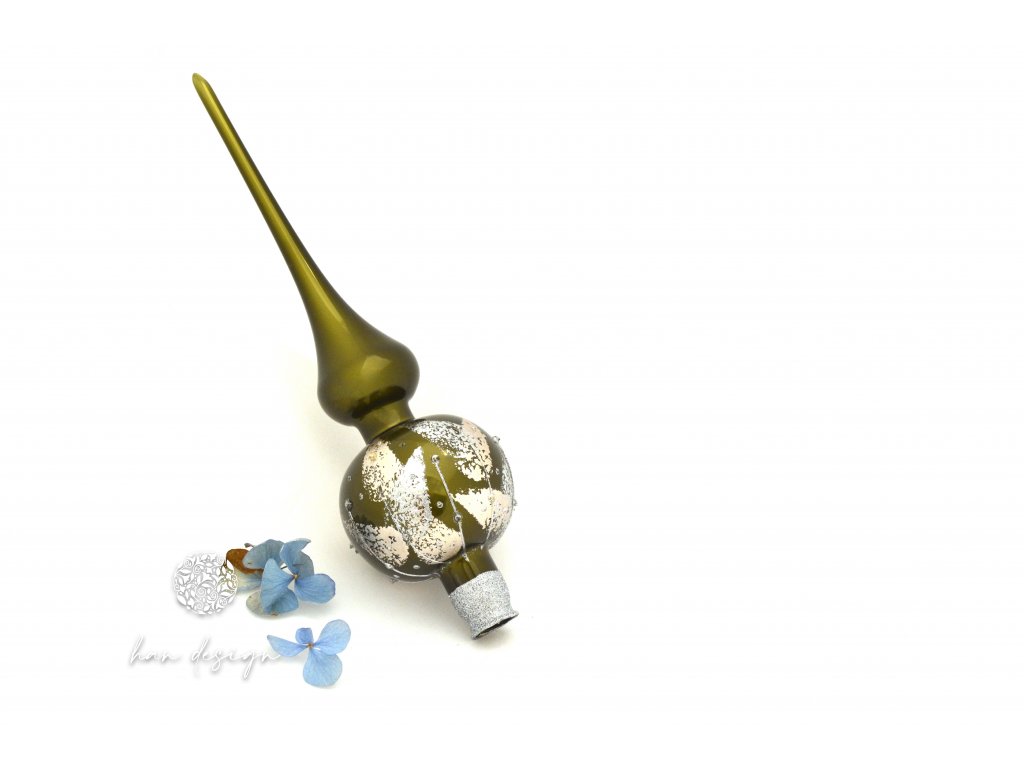 Vyrobená ze skla s efektem olivového porcelánu, zdobená motivem mrazivých lístečků, které ozdobě dodávají jemný třpyt a zimní atmosféru.