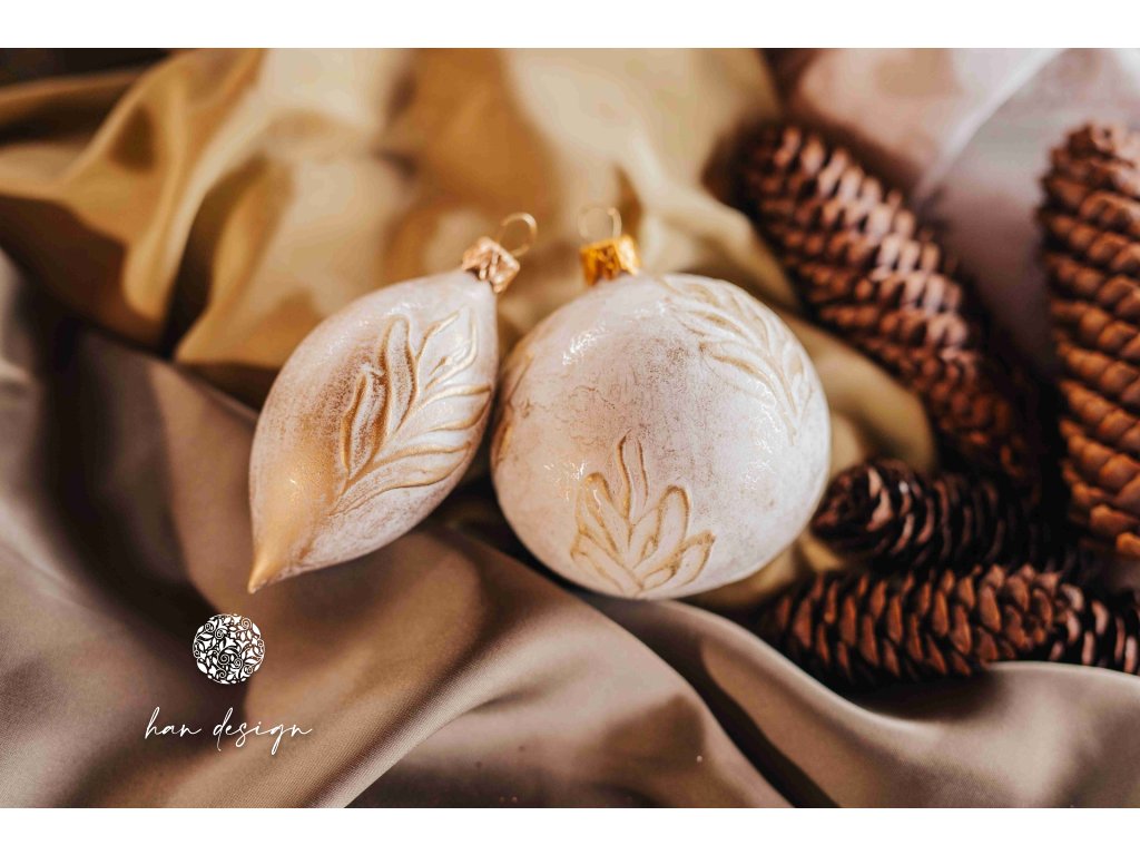 Koule ve dvou velikostech (8 × 10 cm a 6 × 8 cm) a labuť s korunkou (15 × 10 cm).