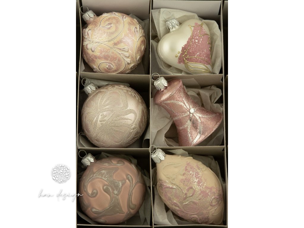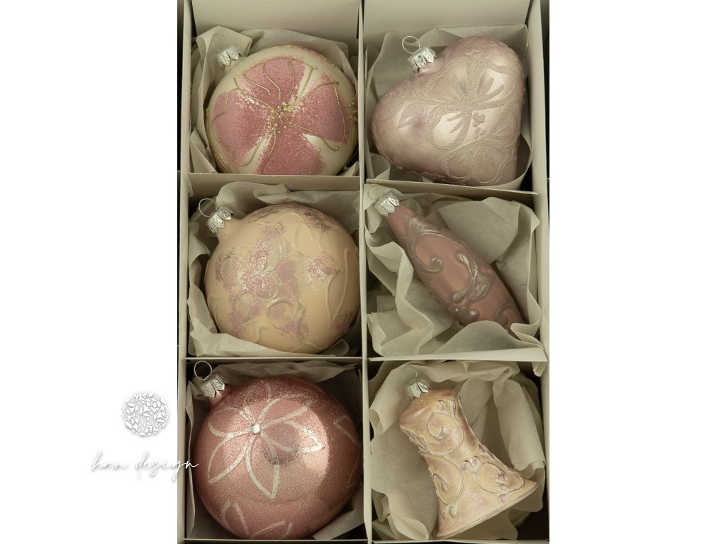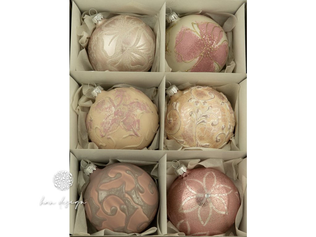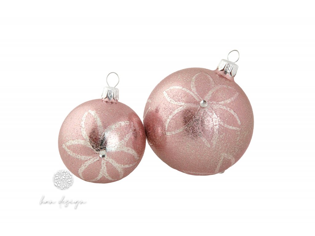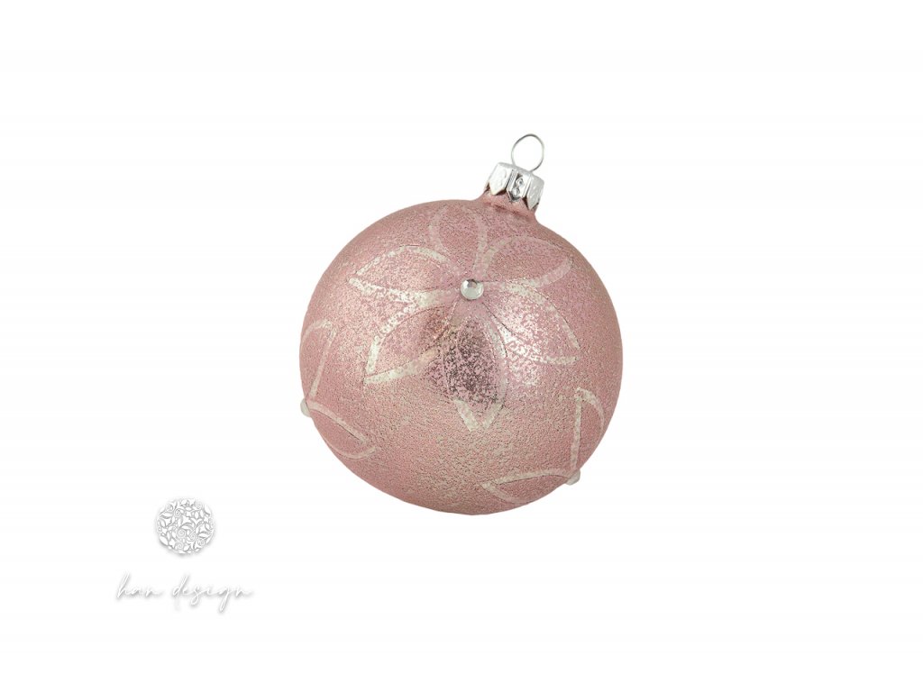 Na povrchu růžového laku rozkvétají květy s jemnou patinou, která jim dodává hloubku a noblesní nádech starých časů. Každý detail působí křehce, jako by se květy zachytily v odlesku jemného světla. Koule se třpytí nenápadně, s romantickou elegancí, která dokáže ozvláštnit interiér i doplnit dekoraci pro výjimečné chvíle.