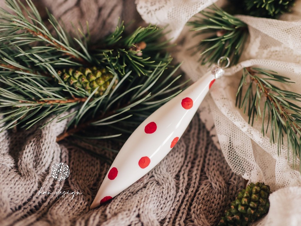 Oliva dlouhá je jako něžný vánek zimního rána, který přináší klid a krásu do vánočního domova. Její štíhlý tvar a jemná ruční malba červených puntíků nesou příběh radosti a tradice, který dokonale ladí s veselým Mikulášem – postavičkou s rozzářenýma očima, jež připomíná dětskou nevinnost a kouzlo svátečního času. Tato kolekce je oslavou ruční práce a lásky k detailu, která oživuje každý kout vánoční výzdoby.