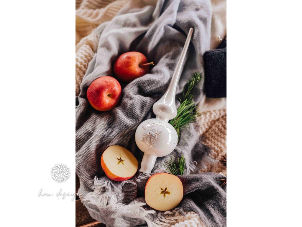 Elegantní vánoční špice v odstínu stříbrnobílého porcelánu je jemným symbolem výšky a slavnostní elegance. Povrch zdobí náznaky pohádkových vloček, které dodávají špici třpytivý, zimní nádech, a přitom zachovávají její čistou a nadčasovou formu. Každý detail odráží precizní řemeslo a lásku k české skleněné tradici.