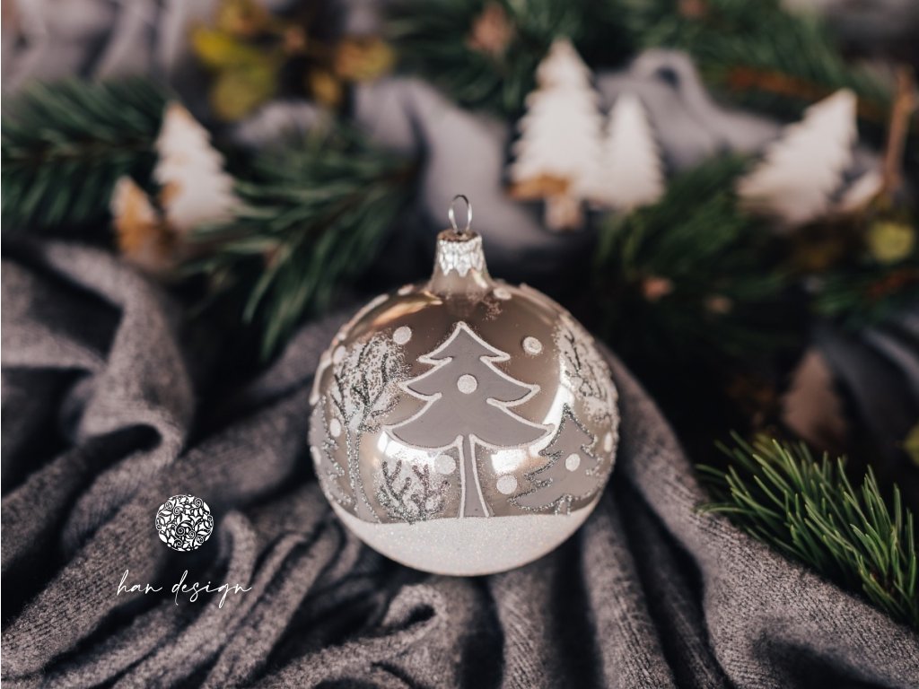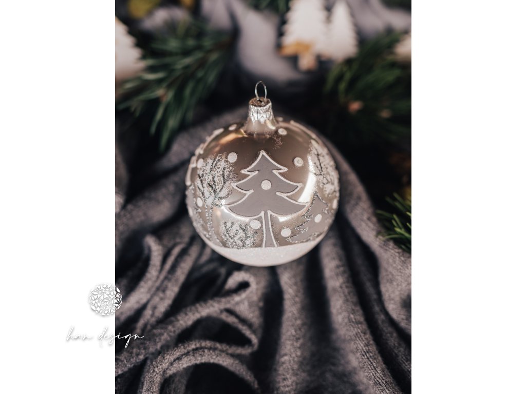 Na povrchu koule se rozprostírá obraz zasněženého lesa – stříbrné větvičky a jemné sněhové vločky vytvářejí kouzelnou zimní scenérii, která připomíná tichý klid mrazivých lesních rán. Koule září elegantním stříbrným porcelánovým odstínem, jenž dodává ozdobě vznešený a nadčasový vzhled. Každý detail jako by zachycoval ticho a hloubku zimního lesa, který vypráví svůj vlastní, tichý příběh.
