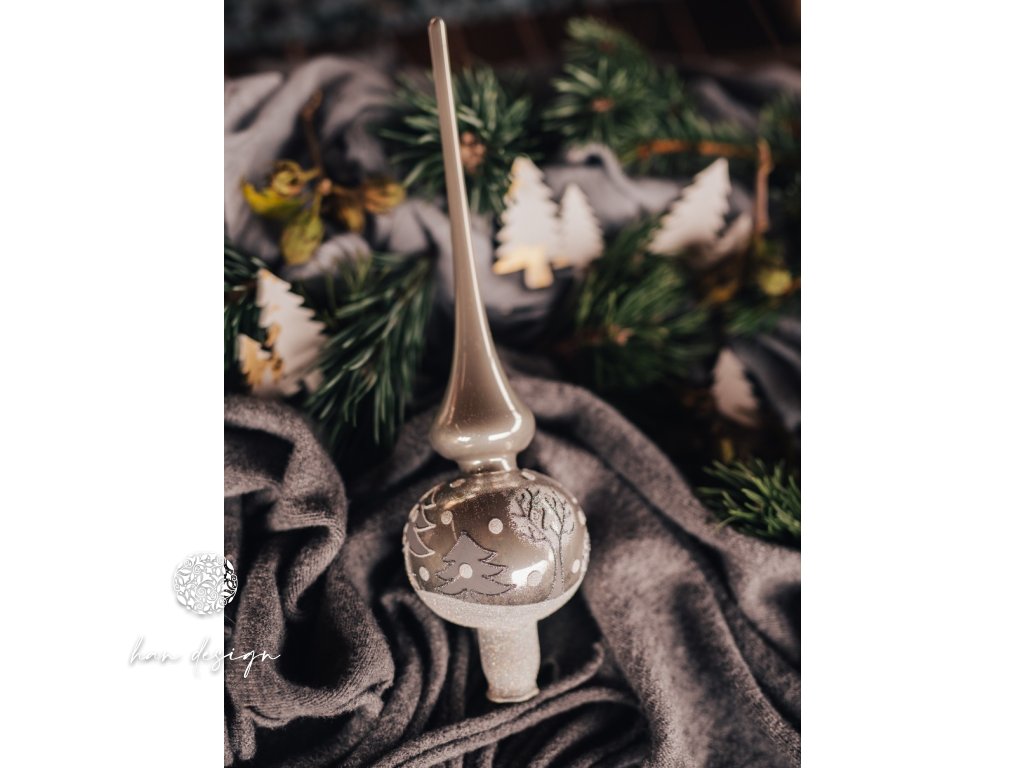 Špice, která korunuje vánoční stromek jako třpytivý klenot zimního rána. Její štíhlý a elegantní tvar zdobí reliéfní větvičky zasněženého lesa, které ve stříbrném porcelánovém odstínu jemně odrážejí světlo a přinášejí do výzdoby pocit ticha a magického klidu. Špice je symbolem ukončení sváteční kompozice s noblesou a půvabem.