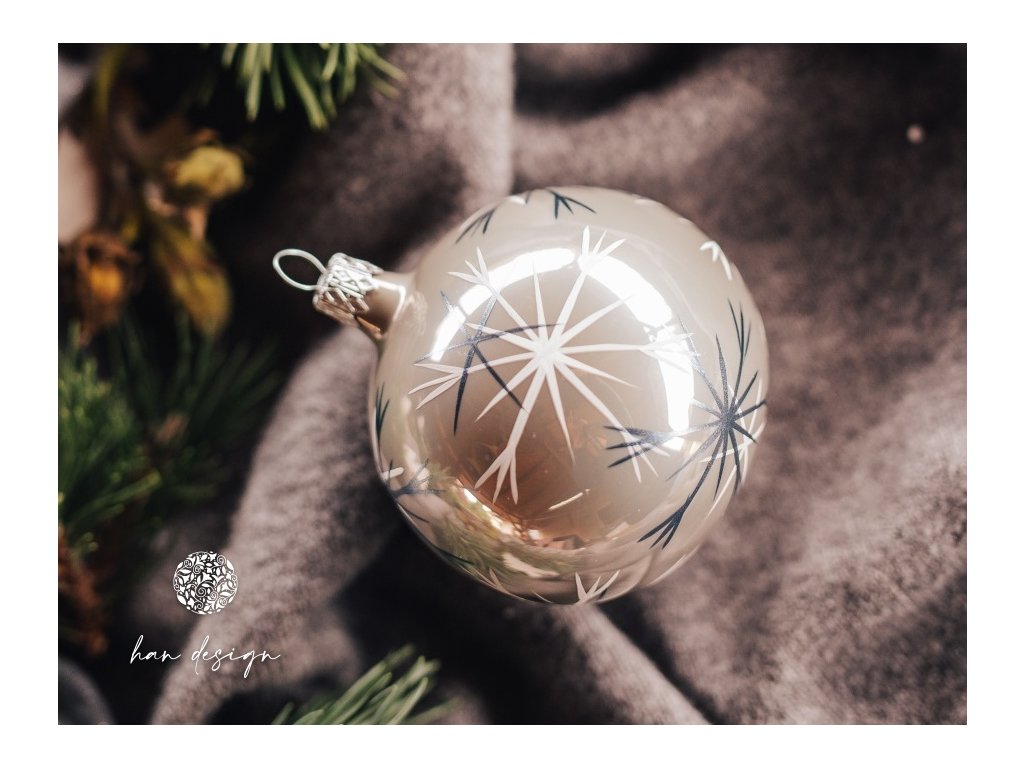 Jemný vzor vločky se rozprostírá po povrchu koule jako chladivá krajka mrazu, která zdobí zimní rána tichou krásou. Každý detail v sobě ukrývá křehkost okamžiku, kdy příroda maluje své nejjemnější a nejdelikátnější tvary. Koule se stává tichým příběhem o zimním klidu a třpytu, který rozzáří každý vánoční stromeček.