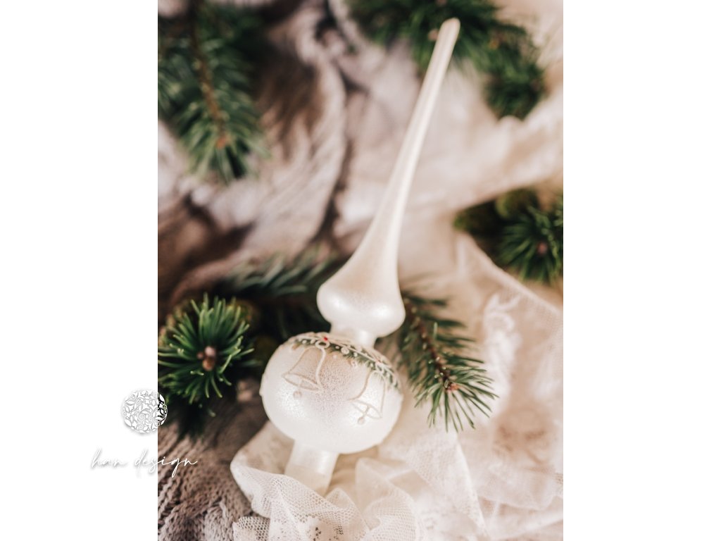 Štíhlá a elegantní špice korunuje vánoční stromek jako poslední tón slavnostní melodie. Motiv jemné zvonečkové girlandy se po jejím těle vine s lehkostí zimní ozvěny a přináší klid, krásu i tradici. Dodává špici nadčasovou eleganci a třpytivou jemnost – jako by byla pokrytá jemnou jinovatkou, která nikdy netaje. Špice není jen ozdoba, je to tichý vrchol celého příběhu.