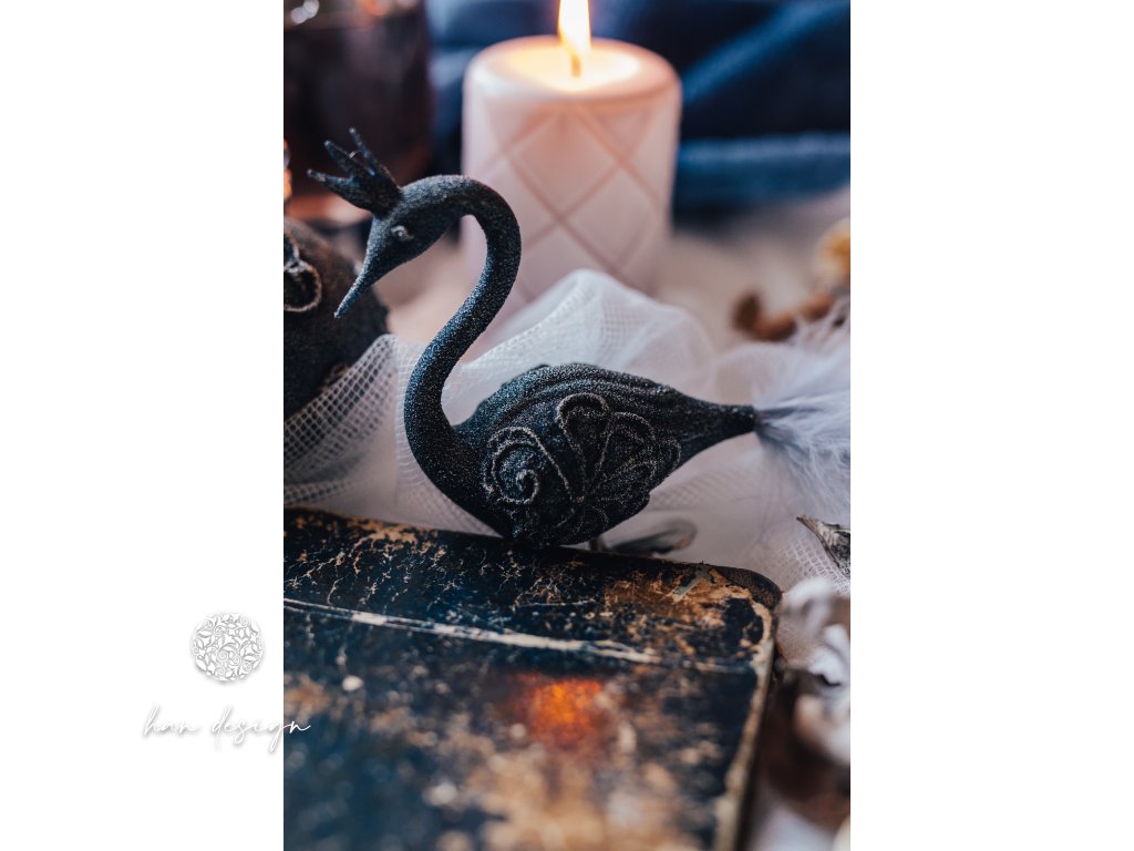Tmavě modrá matná labuť je zdobena jemným dekorem pod balotinovou vrstvou, který jí dodává elegantní hloubku a noblesní vzhled. Každý detail peří i korunky je pečlivě propracovaný, čímž vzniká harmonická a sofistikovaná ozdoba, jež zaujme jemností i výrazem.