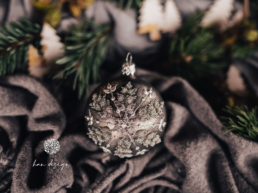 Na tmavě šedém matném povrchu se jemně rýsuje reliéfní vločka, tvořená drobnými skleněnými kuličkami – jako by na kouli usedla ledová hvězdička utkaná z ranní jinovatky. Kuličkový motiv dodává ozdobě strukturu a hloubku, zatímco matný povrch vytváří působivý kontrast mezi světlem a stínem. Koule působí moderně a přitom něžně – jako tichá vzpomínka na zimní ráno.