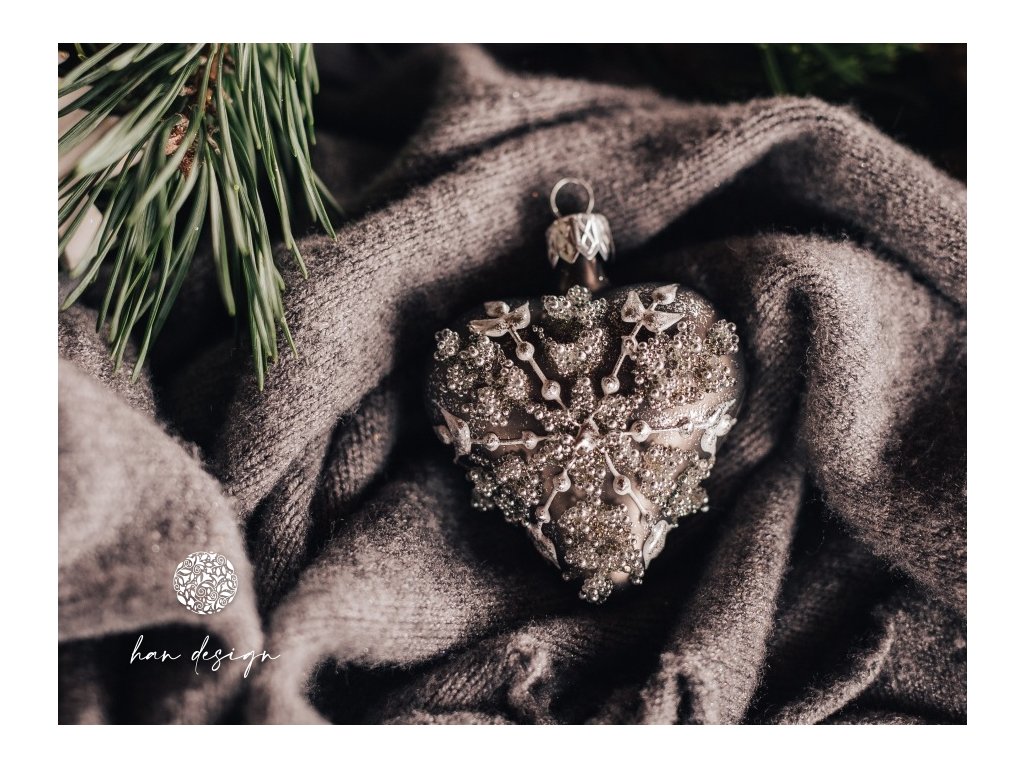 Skleněné srdce, jako něžné připomenutí toho, co v sobě Vánoce skutečně nesou – ticho, lásku a křehkost okamžiku. Na jeho tmavě šedém matném povrchu se jemně rýsuje plastická vločka, složená z drobných kuliček – jako by ji stvořila ranní jinovatka. V kontrastu světla a stínu vynikne jeho tvar i hloubka, srdce působí moderně, ale zároveň citlivě a osobně.