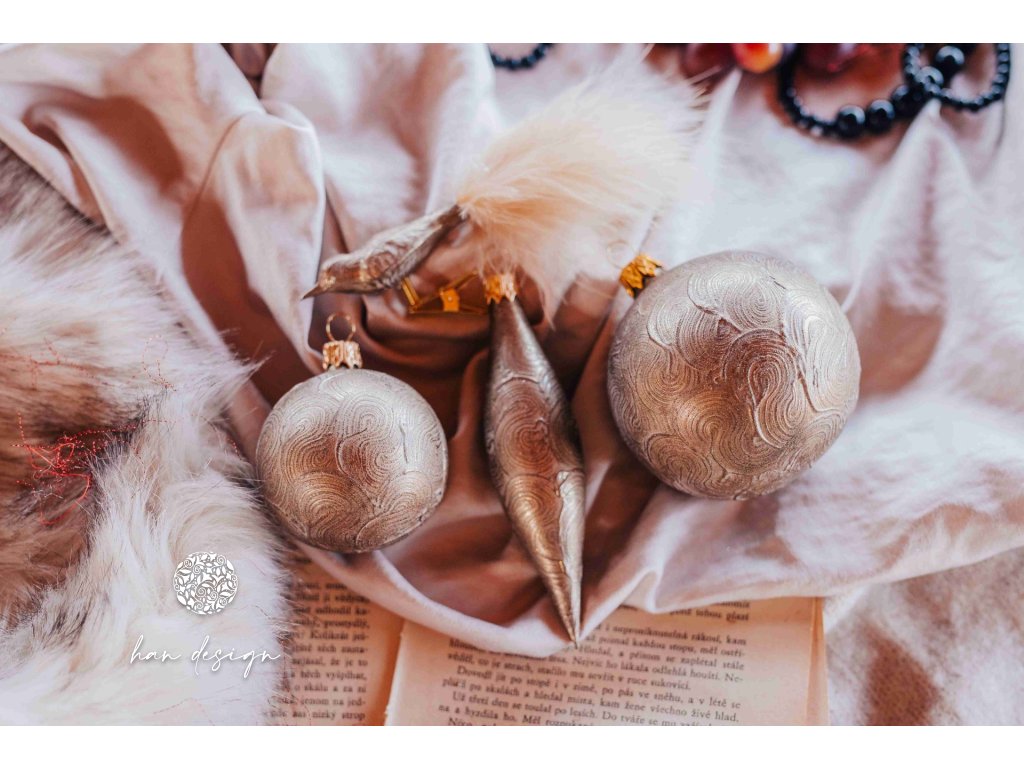 Koule „Zlatý lesk“ (8 × 10 cm a 6 × 8 cm), oliva dlouhá (3 × 14 cm).