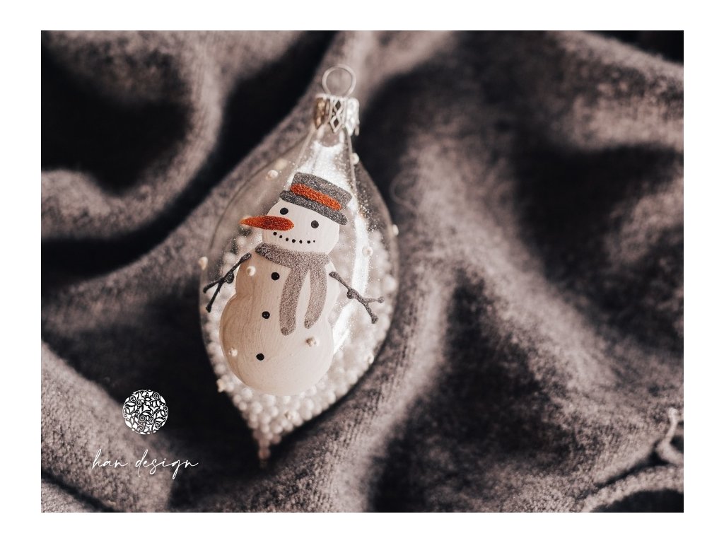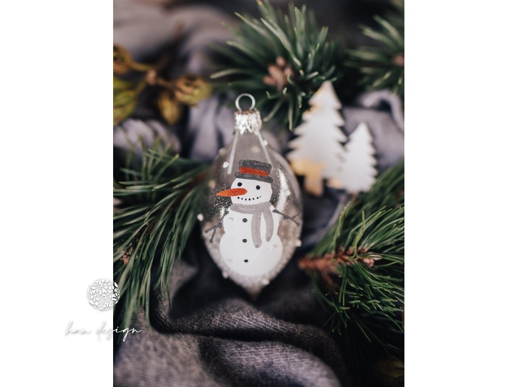 Jemný motiv sněhuláka s kloboukem zdobí hladký povrch olivy, jejíž tvar připomíná tradiční vánoční symbol. Třpytivý povrch evokuje zimní krajinu pokrytou čerstvým sněhem. Detailní malba dodává ozdobě hravý a přívětivý charakter, který přináší do výzdoby teplo a radost.