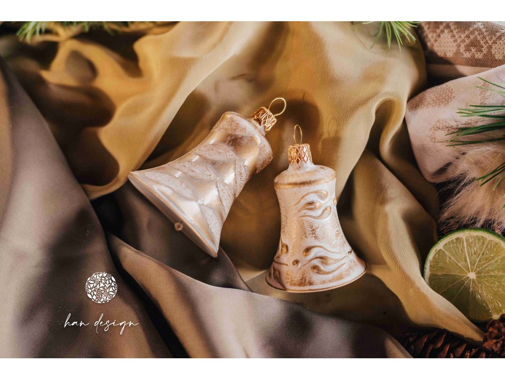 Decentní zvonek v barvě zlatobílého efektu s jemným dekorem inspirovaným přírodní kresbou. Jeho drobný a elegantní tvar působí jemně a nadčasově, díky čemuž se hodí jako ozdoba nejen na sváteční stromeček, ale i jako dekorace po celý rok.