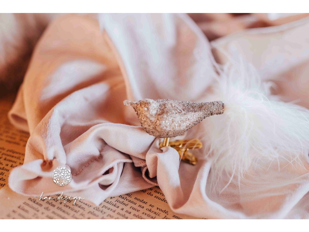 Roztomilý ptáček v barvě zlatohnědého metaliku s dekorem inspirovaným motivem přesmočené balotiny. Jeho hladký povrch a plastický detail dodávají dekoraci jemnost a luxusní vzhled. Díky nadčasovému designu se hodí jako ozdoba po celý rok a stává se originálním uměleckým doplňkem.