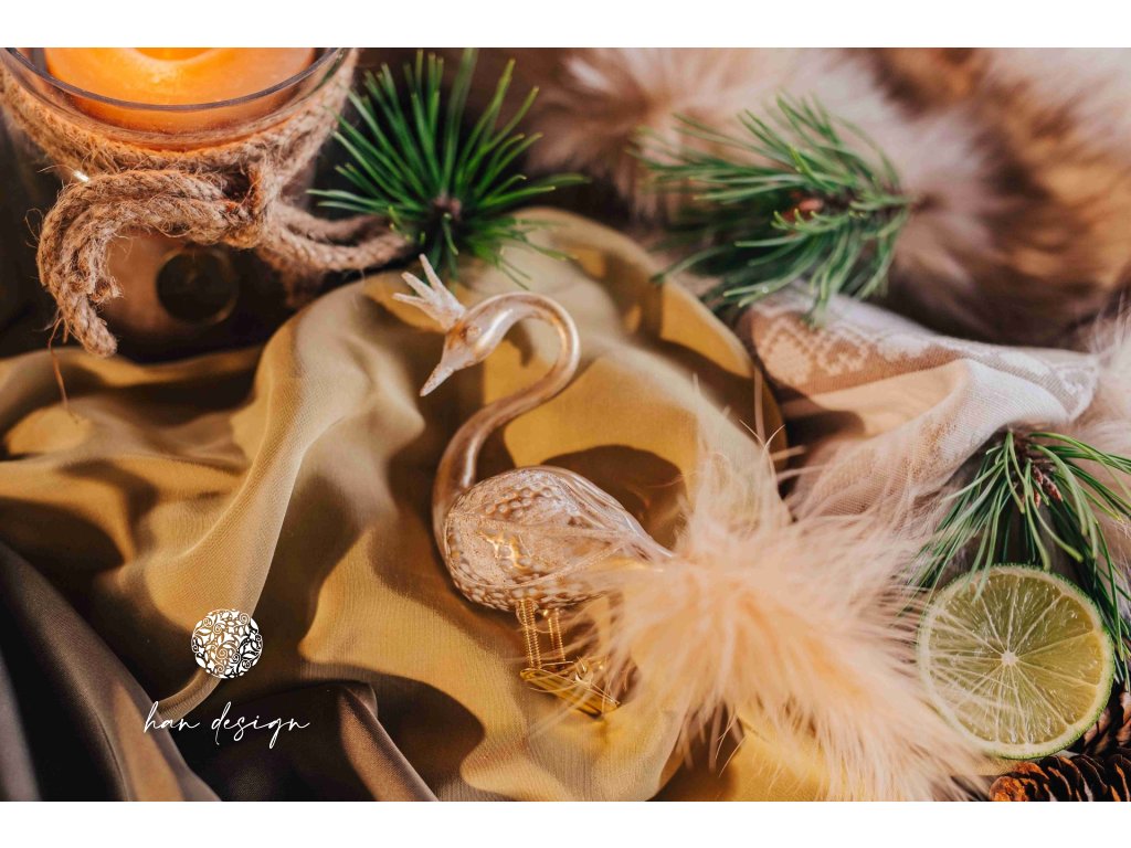 Něžná labuť v barvě zlatého písku, jejíž povrch doplňuje jemný dekor inspirovaný přírodní harmonií. Elegantní tvar s ozdobným peřím a korunkou vytváří dojem ušlechtilosti a klidu. Dílo, které spojuje krásu řemesla s poetikou přírody, je vhodné jako dekorace po celý rok.